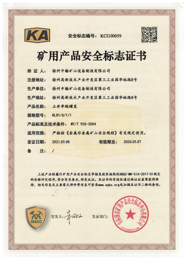 XS110楔形繩環(huán)礦安證書